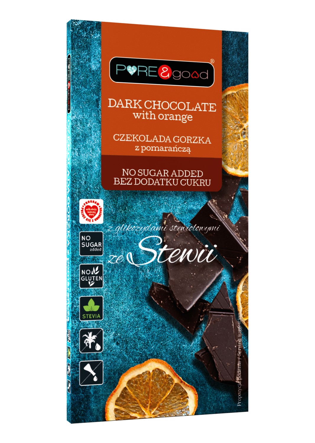 CZEKOLADA GORZKA Z POMARAŃCZĄ ZE STEWIĄ BEZ DODATKU CUKRU BEZGLUTENOWA 125 g – PURE&GOOD